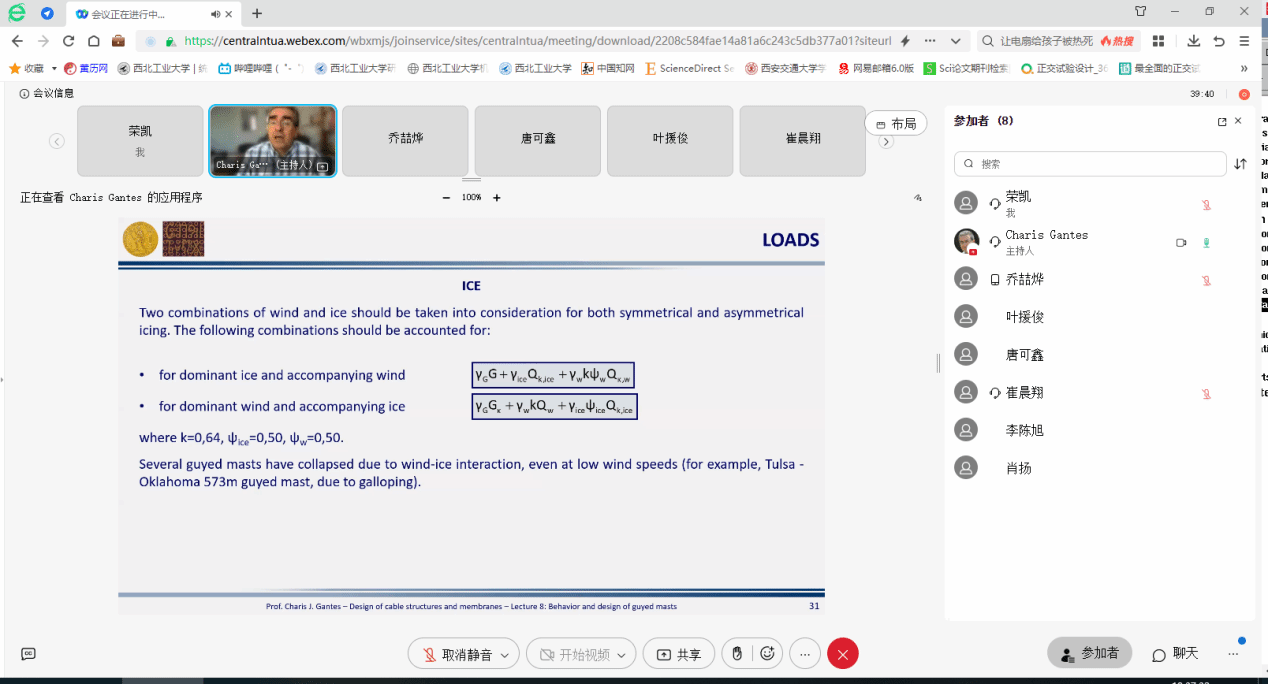 受李博老师邀请,雅典国立技术大学Charalampos GANTES讲授《索结构》,该课程中涉及的主题包括单根索对各种施加载荷的静态响应的经典或精确理论,以及这些理论的介绍和应用。理论还包括对单根索静态响应的讨论,以及在工程中近似应用该理论,对索结构进行动态响应分析。同时,对桅杆、缆索桁架和悬索桥进行了讨论。然后,使用具有扩展的平衡理论来处理旋转张力膜形式的三维表面,以覆盖小的弹性变形。本次暑期课堂授课效果良好。授课教授认真负责,熟悉课程内容,讲授内容可做到深入浅出,课堂效果好。在帮助同学们掌握索结构的静力学与动力学求解方法的同时又锻炼了同学们的英语听说能力。