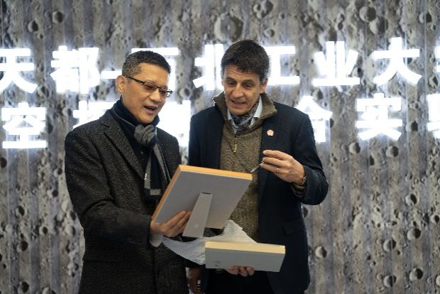 深空探测联合实验室主任常洪龙教授对奎洛兹教授到访表示热烈的欢迎,并为奎洛兹教授赠送了实验室特色礼物。奎洛兹教授表示感谢。