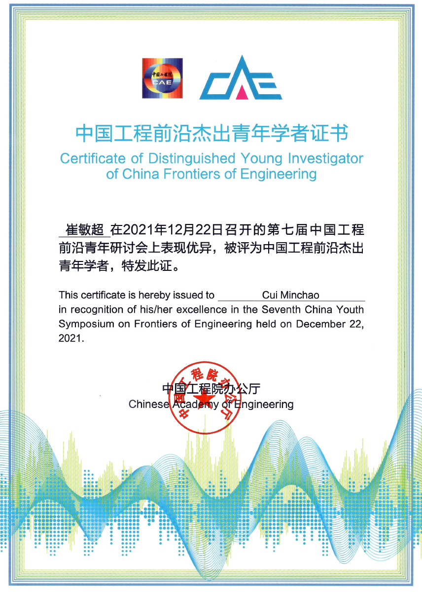 青年教师崔敏超受邀参加研讨会并荣获由中国工程院颁发的“中国工程前沿杰出青年学者”荣誉证书。