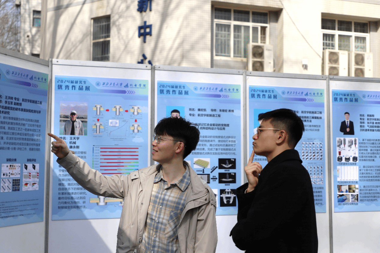 在众多优秀的毕业成果中,航空宇航制造工程专业毕业生孙文博的作品格外引人关注。他针对TC4钛合金表面耐磨损性能差的问题,开展了表面纳米化以及离子渗氮复合表面处理研究,极大提升了TC4钛合金的耐磨性能,为TC4钛合金表面强化提供了一种新的方法。热情的讲述吸引了各专业学生的目光,引来众多学生驻足观看、学习与探讨。