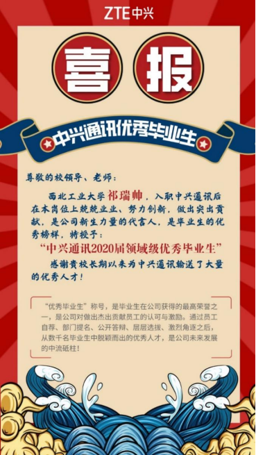 近日,中兴通信公司发来喜报,性爱无码 2020届硕士祁瑞帅在工作中业绩突出,被评为中兴通信2020届领域级优秀毕业生