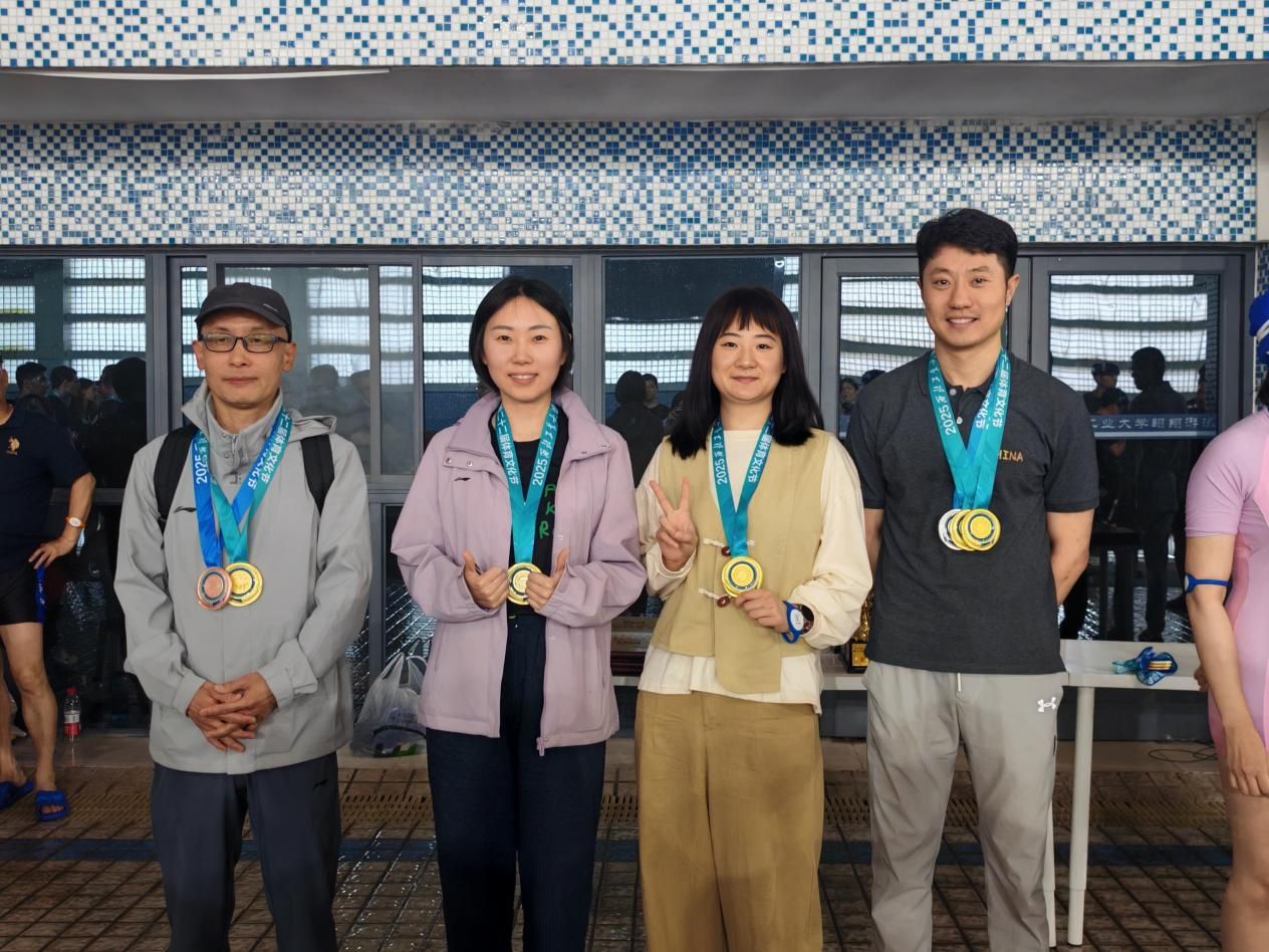 游泳健儿们如水中蛟龙,在泳池中奋勇争先。他们凭借精湛的泳技和默契的配合,在 4×50 米接力项目中一路领先,最终以绝对优势勇夺冠军,为学院赢得了荣誉。付佳伟老师更是表现出色,在 45 岁以下组 50 米自由泳中一路领先,以出色的成绩夺得冠军,在 50 米蛙泳中又斩获第 2 名;李启鹏老师也在 45 岁以上组 50 米自由泳中脱颖而出,获得第 3 名。经过全体游泳队员的共同努力,性爱无码