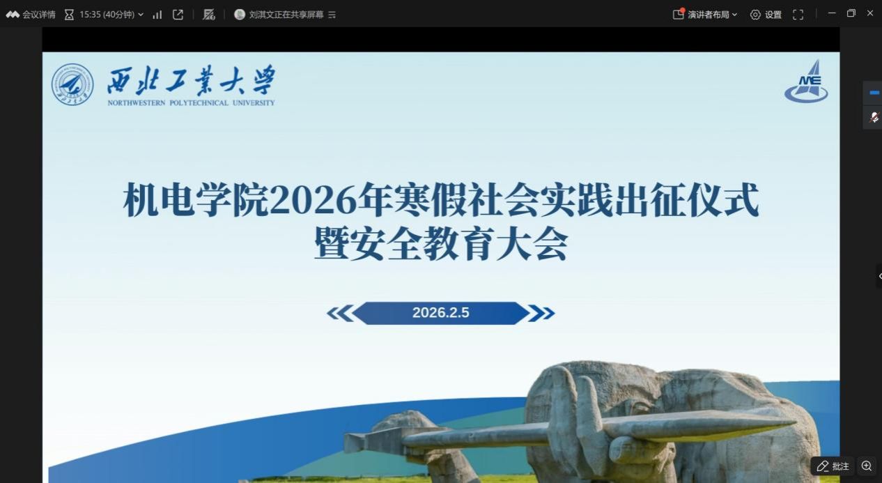 以线上形式召开2026年寒假社会实践出征仪式暨安全教育大会。由学院学生会主席团成员刘淇文主持本次寒假实践出征仪式,学院团委书记冯硕参与出席会议。