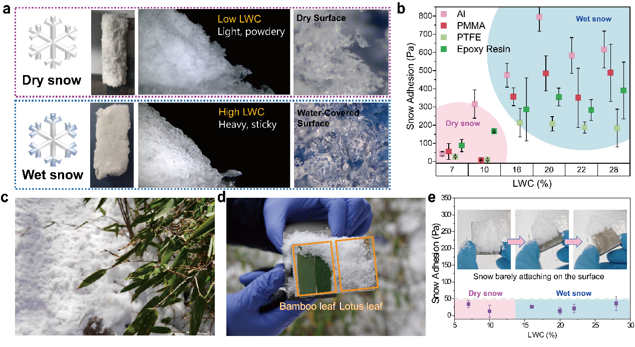 图 1 , 雪的物理性质与秦岭箭竹叶的低雪粘附特性。